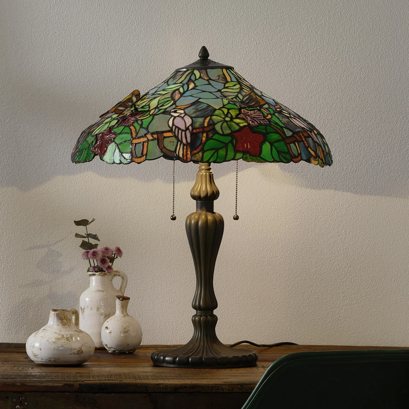 Australia-bordlampen er utsmykket med blader, kakaduer og sommerfugler i Tiffany-stil Denne lampeskjermen i Tiffany-stil ser ut som et lite paradis. Høyt oppe i trærne, mellom grønne og delvis høstlige blader, har flere kakaduer funnet seg til rette, og sommerfugler har også slått seg ned. Med dette forseggjorte designet forvandler Australia-bordlampen hjemmet til et idyllisk sted og lar rommet skinne i varme farger. Australia-bordlampen har to trekkbrytere for separat veksling av lyspærene, som i likhet med den robuste sokkelen er i gammel messing.