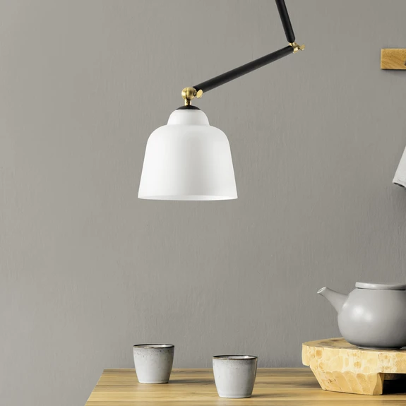 Justerbar Neoretro vegglampe med lang arm og lampeskjerm i frostet glass Neoretro vegglampen med sin karakteristiske design og materialsammensetning er enkel, men likevel tiltalende. Den svarte metallkonstruksjonen består av et rundt veggfeste og to lange armer. I tillegg finnes det en konisk lampeskjerm i frostet glass. Totalt tre messingskjøter gjør det mulig å justere utspringet og skjermens posisjon. Neoretro kan også monteres i taket.