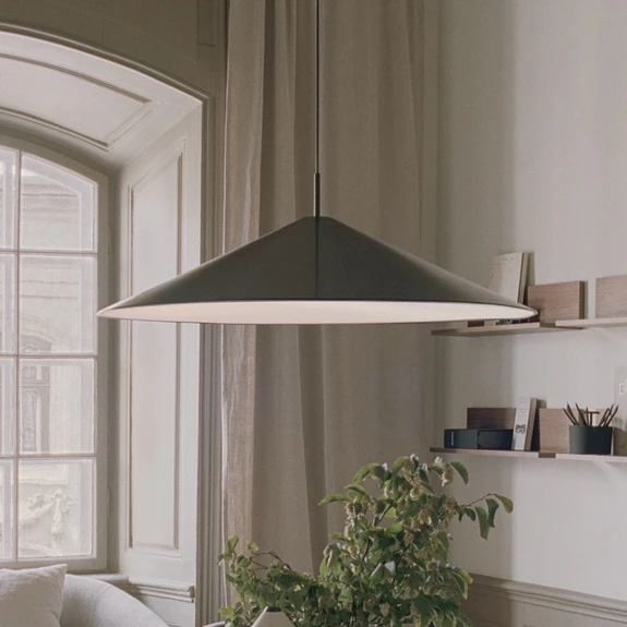 Brolly LED-hengelampe med lampeskjerm i anodisert, børstet aluminium LED-hengelampeserien Brolly med samme navn viser styrken i enkle former. Disse elegante lampene er presise og gjennomtenkte, og har en sofistikert, nesten villedende enkelhet som gjør dem til tidløse spesialiteter i enhver innredning. I Brolly LED-pendellampen utvides den koniske lampeskjermen til en diameter på 70 eller 90 centimeter, avhengig av hvilken versjon du velger, og de skarpe kantene understreker designens arkitektoniske uttrykk. Den konkave diffusoren sprer et mykt og sjenerøst lys som ikke blender deg når du sitter under lampen. Den integrerte LED-modulen gir et varmhvitt lys med svært god fargegjengivelse (Ra90). La denne LED-hengelampen sveve over spisebordet eller andre steder der det er behov for et behagelig lys og en uttrykksfull silhuett.