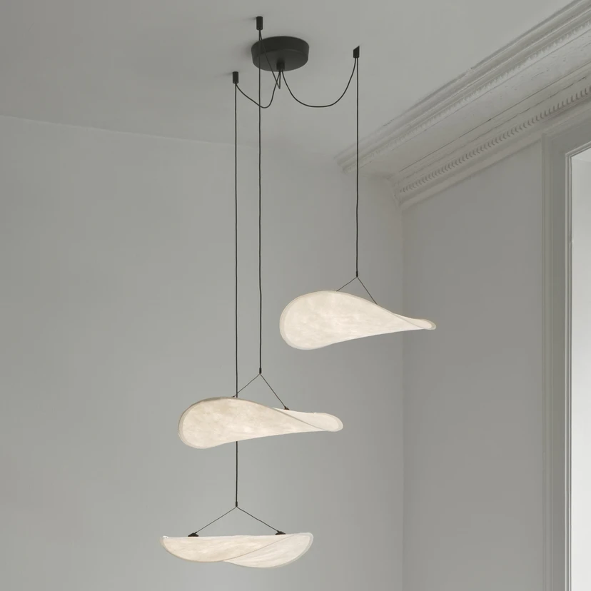 3 lyskilder Tense LED-hengelampe med lampeskjermer av Tyvek og ramme av karbonfiber I en formasjon bestående av tre mindre skjermer, hver med en diameter på 55 cm, er Tense LED-hengelampe et sofistikert alternativ til klassiske lysekroner. De tre lampeskjermene fremstår i en ensartet konstellasjon og smelter sammen til et enhetlig, voluminøst, men likevel vektløst uttrykk. Lampeskjermene i Tyvek gjenspeiler varemerket til Tense-serien fra New Works og sprer et mykt lys både ovenfra og nedenfra. Varmhvite LED-moduler er integrert som standard.