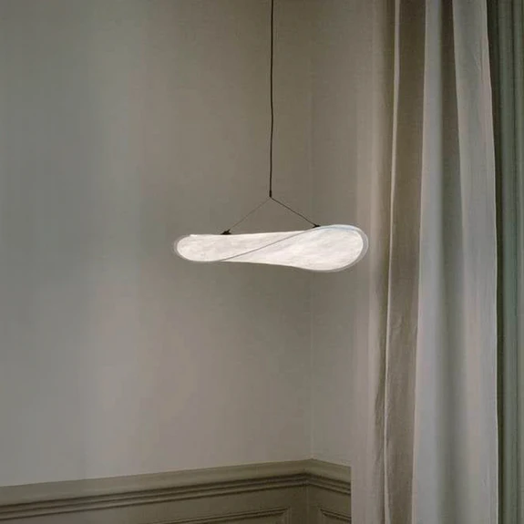 Tense pendellampe light Ø55 White strekker seg ut som en myk sky. Overflaten på lampen består av et materiale som i farge og struktur ligner på fint hvitt papir. Faktisk er det det innovative materialet Tyvek, som både er mykt og holdbart – og 100 % resirkulerbart. Materialets fleksibilitet gjør det mulig å fremheve den buede formen på pendellampen rundt et slankt stativ.
