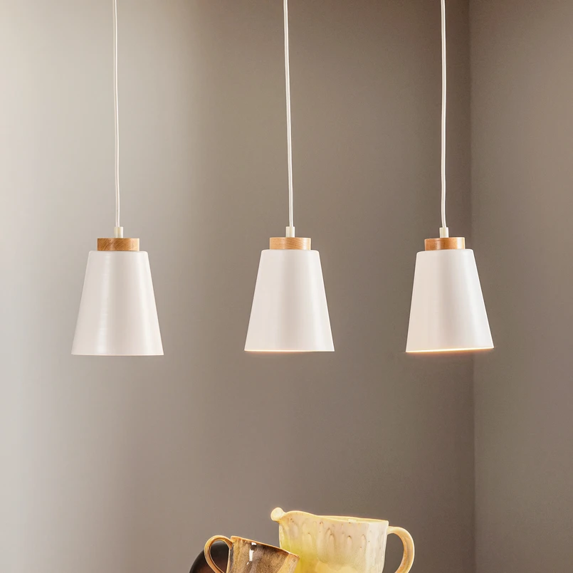 Pendellampen Bolero 3 kombinerer moderne design med høykvalitetsmaterialer og setter stilfulle aksenter i alle rom. Denne lampen med 3 lyskilder er laget av en kombinasjon av stål og lyst tre og tilbyr en harmonisk kombinasjon av funksjonalitet og estetikk. Den hvite fargen kompletterer det naturlige treverket og skaper en tidløs eleganse som passer perfekt inn i stuer, kjøkken eller spisestuer.