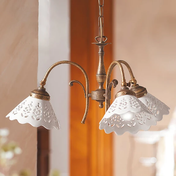 Semino - dekorativ pendellampe i keramikk Tre formskjønne keramikkskjermer med integrert hullmønster i kombinasjon med en bronsefarget, klassisk utformet ramme - denne kombinasjonen gir den rustikke pendellampen Semino. Den passer spesielt godt inn i landlig stil. De matchende lyspærene kan bestilles direkte fra tilbehøret.