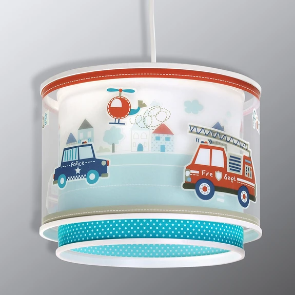 Motiver som lyser i mørket - Police pendellampe Politibetjenter og brannmenn er de små guttenes store helter. Med motiver av helikoptre, politibiler og brannbiler vil pendellampen Police glede alle barn. Med denne lampen kan guttene fortelle om drømmejobben sin hver dag og være godt beskyttet når de leker og sover. Et spesielt høydepunkt ved pendellampen kommer først til syne når lyset slukkes om kvelden, for da begynner det fargerike motivet å gløde. Made in Europe.