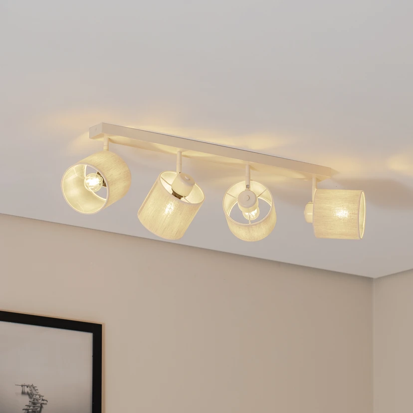 4 lyskilder Suerte taklampe i kremhvit finish med stoffskjermer Enkel og tidløs, men elegant og koselig - Suerte taklampe er den ideelle ekstra lyskilden i stue og soverom. Fire sylindriske lampeskjermer er montert under den kantete baldakinen i kremhvit finish. Disse kan justeres og er laget av beige linstoff. Lyset fra E14-pærene som skal brukes, slippes direkte ut gjennom de vertikale åpningene i lampeskjermene og slippes også forsiktig ut gjennom stoffet. Produksjonen foregår i Europa.
