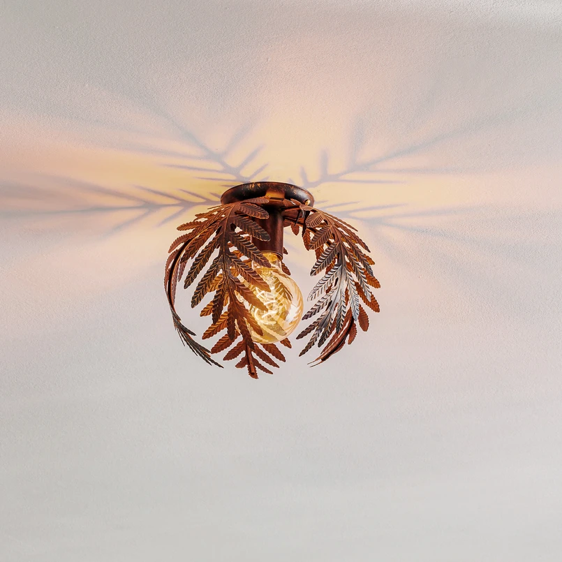 Taklampen Felce imponerer med sitt unike design, som minner om formen på en bregne. Den er laget av høykvalitets jern og har en elegant antikkbronsefinish, og passer perfekt inn i ulike romkonsepter. Enten i stuen, gangen eller spisestuen – lampen setter stilfulle aksenter og gir hvert rom en spesiell atmosfære.