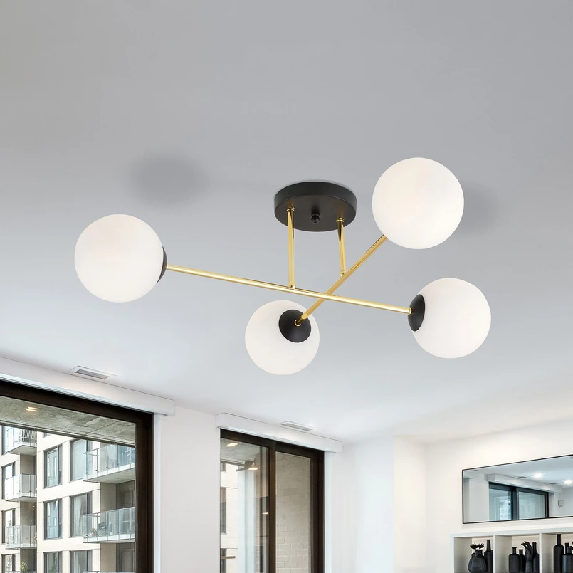 Taklampe Magnum, 4 lyskilder, opalvit/gull/svart, glass