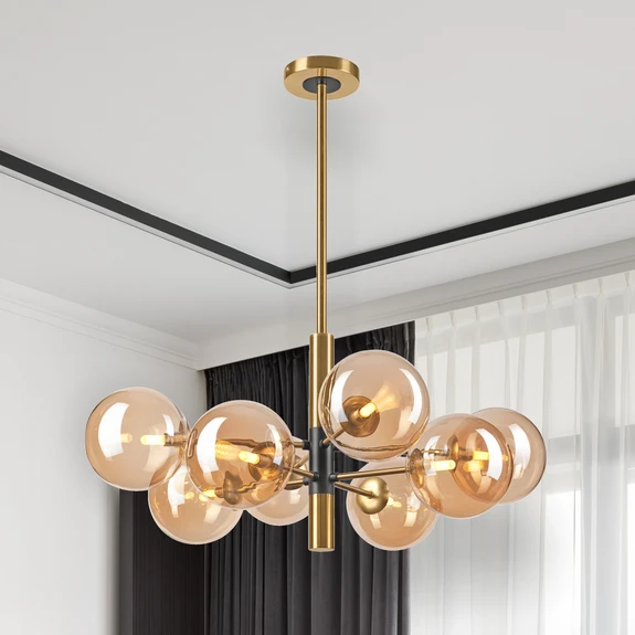 Taklampen Natalia, 8 lyskilder, kombinerer moderne design med høykvalitetsmaterialer som glass og stål. Den gyldne og ravfargede fargen gir ethvert rom et luksuriøst preg og skaper en varm og innbydende atmosfære. Takket være muligheten for ekstern dimmbarhet kan lysintensiteten justeres fleksibelt for å skape forskjellige stemninger. Denne lampen er ideell for stuer og spisestuer samt gangområder og tilbyr en stilig belysningsløsning for mange forskjellige romkonsepter.