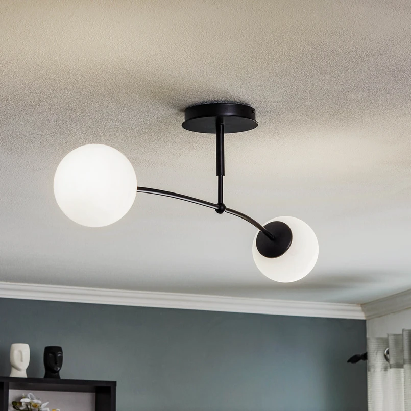 Taklampen Pregos 2 kombinerer moderne design med funksjonell belysning og setter stilfulle aksenter i ethvert rom. Lampen er laget av høykvalitets metall og glass og presenterer seg i en elegant kombinasjon av svart og hvitt. Konstruksjonen med 2 lyskilder sørger for jevn lysfordeling og skaper en behagelig atmosfære i gangen, soverommet, stuen eller spisestuen.