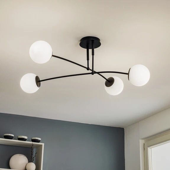 Taklampen Pregos 4 i svart imponerer med sitt moderne design og kombinasjonen av høykvalitets metall og glass. Denne lampen med 4 lyskilder er ideell for ulike oppholdsrom som gang, soverom, stue og spisestue. Den stilige fargen i svart og hvitt gir ethvert rom en tidløs eleganse, mens de klare linjene og den høykvalitets utførelsen sørger for et harmonisk helhetsinntrykk.