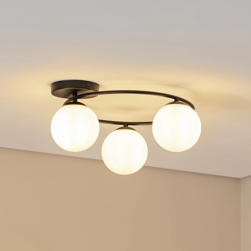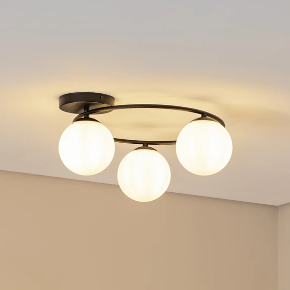 Taklampen Sopra kombinerer moderne design med høy kvalitet og er laget av glass og stål. Den opalhvite og svarte fargen gir lampen en tidløs eleganse som passer perfekt inn i ulike romkonsepter. Enten i stuen, spisestuen, gangen eller på kjøkkenet – Sopra sørger for stilig belysning og er et produkt av europeisk håndverk.