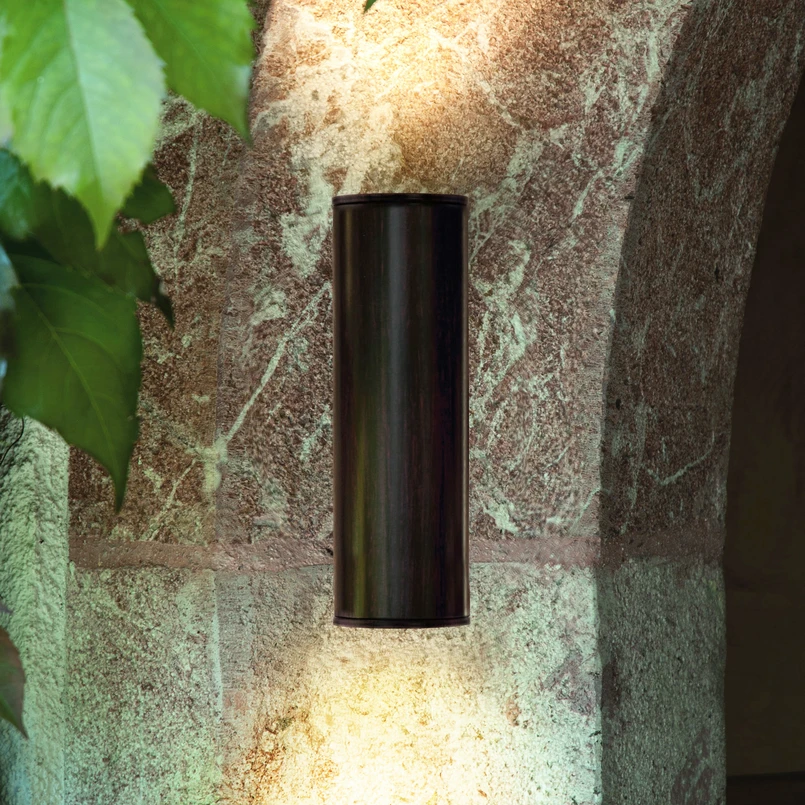 Utevegglyset med energieffektiv LED-teknikk er som skapt for enestående utforming av husfassaden. Sylinderformet og med antikkbrun finish, dette lyset blir et dekorativt dekorobjekt på balkong og terrasse. To GU10-LED-pærer stråler vertikalt ut av lampehuset, sik at det oppstår et vakkert lysskinn på veggen.