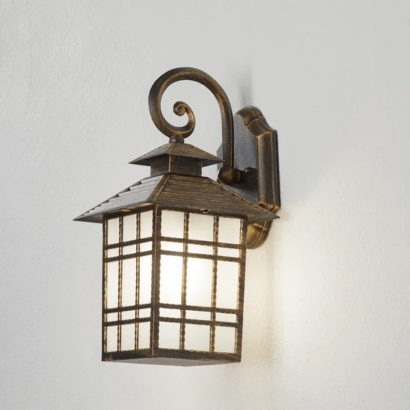 Den utendørs vegglampen Ilka er som en tradisjonell lykt. Stammen er laget av patinerte trykkstøpt aluminium og satinerte glasskiver som understreker lampens kvalitet og gir en stemningsfull belysning.