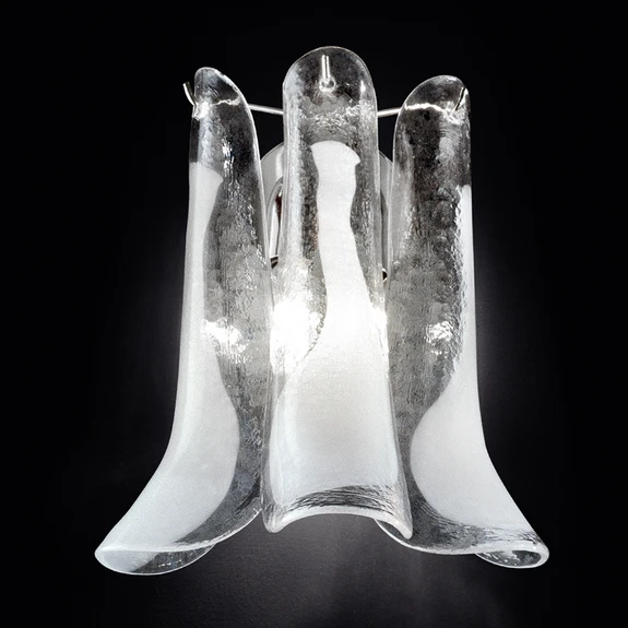 Iøynefallende vegglampe Tulipani i forkrommet metallDen uvanlige vegglampen Tulipani tiltrekker seg beundrende blikk. Den består av en veggbrakett i forkrommet metall som det er festet tre glasselementer foran. Disse er dekorert med mønstre av hvitt glass og holdes fast på veggfestet ved hjelp av bånd. Fremspringet er 12,5 cm.