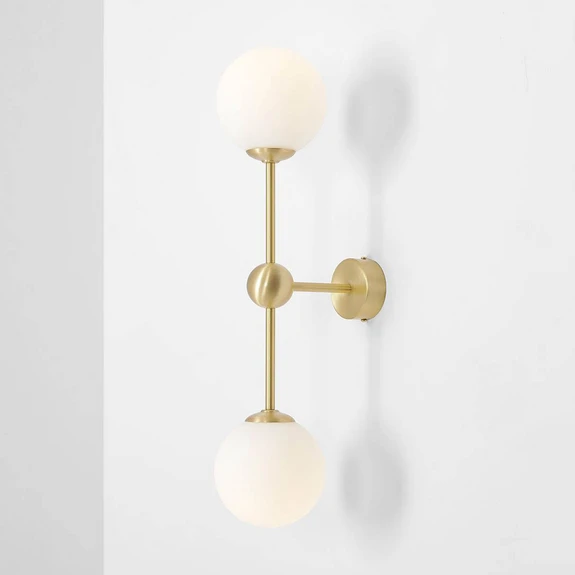 Vegglampe Alison, 2 lyskilder, kombinerer moderne design med høykvalitetsmaterialer. Den er laget av metall og matt glass og utstråler en tidløs eleganse som passer perfekt inn i ulike romkonsepter. Kombinasjonen av messingfargede og hvite elementer gir lampen et edelt utseende som setter aksenter både i stuen, gangen eller spisestuen.