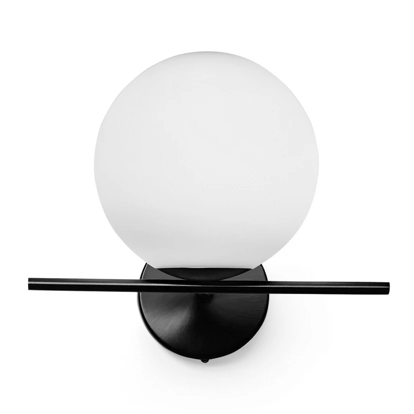 Vegglampe Jugen med en lampe laget av blåst glassVegglampen Jugen er laget av trendy materialer - metall og glass, som alle lamper i Jugen-serien. Den består av en svart veggbrakett, som en diskret metallstang er festet horisontalt til. Den hvite glasskulen er plassert på stangen og dekorerer hver vegg stilig. Denne lampen kommer fra Miloox-produktlinjen fra Sforzin, som er preget av en uvanlig frisk design og kombinasjonen av trendy materialer.