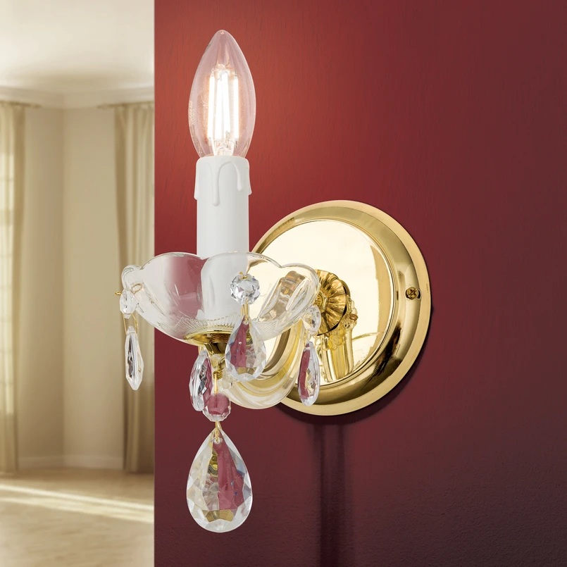 Denne stilige vegglampe Marie Claire i klassisk design bader ethvert oppholdsrom i strålende lys med sine glitrende krystaller. En praktfull og vakker lampe som gjør ethvert rom til noe helt spesielt. Krystallene skaper vakre lyseffekter gjennom lysrefleksjonen og innbyr til velvære. Slik kan du tilbringe hyggelige stunder med stil og skjønnhet.