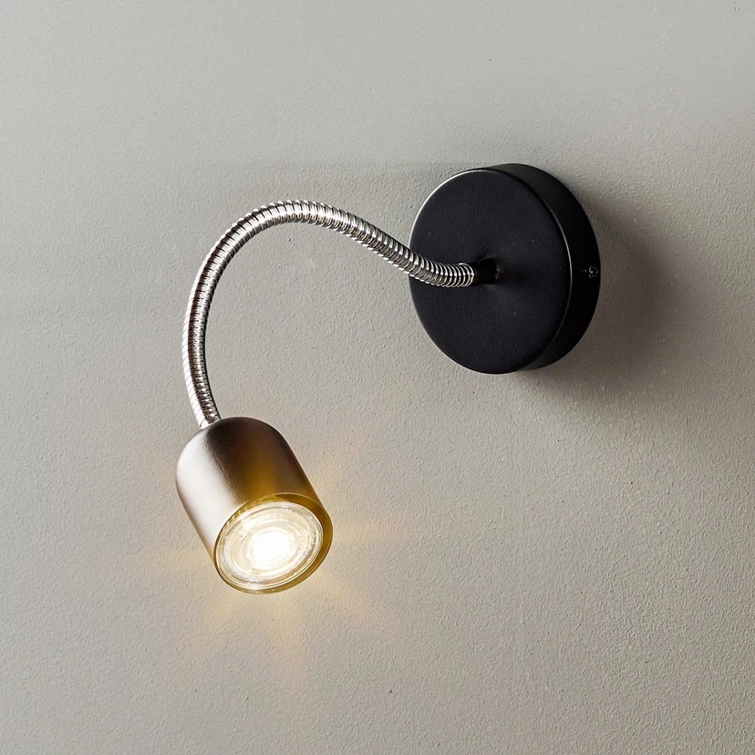 Vegglampe Maxi med fleksibel arm i svart kombinerer moderne design med praktisk funksjonalitet. Denne lampen er laget av høykvalitetsstål og passer perfekt inn i ulike oppholdsrom som stue, soverom og spisestue. Den fleksible armen gjør det mulig å justere lyset individuelt, slik at du kan skape målrettede belysningsscenarier.