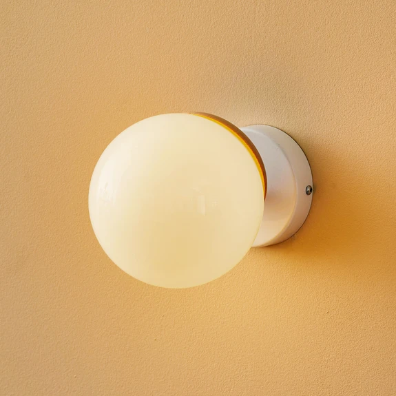 Vegglampe Sfera 1 lyskilde kombinerer moderne design med naturlige materialer og skaper en harmonisk atmosfære i alle rom. Denne lampen er laget av glass, tre og stål og imponerer med sin enkle eleganse og det varme utseendet til det lyse treverket. Den opalhvite fargen sørger for en myk lysfordeling som gir behagelig belysning både i stuen, spisestuen og gangen.