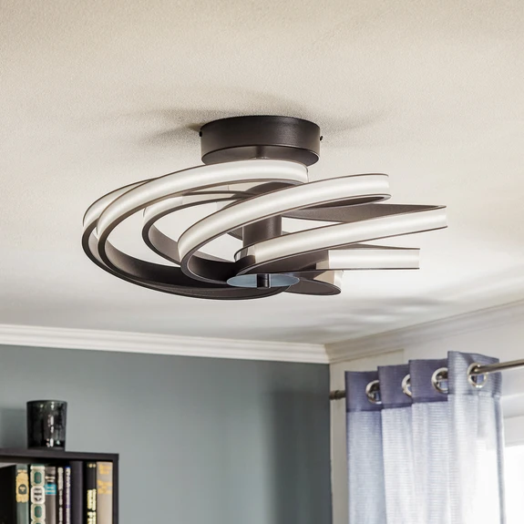 Moderne kurver - Zoya LED-taklampe Et design som imponerer: Brede metallister med integrerte LED-striper bøyer seg elegant rundt braketten på Zoya taklampe og skaper et harmonisk helhetsinntrykk. Takket være de buede stripene gir LED-taklampen belysning på alle sider og sørger dermed for en solid omgivelsesbelysning i oppholdsrom - enten det er stue, soverom eller gang.